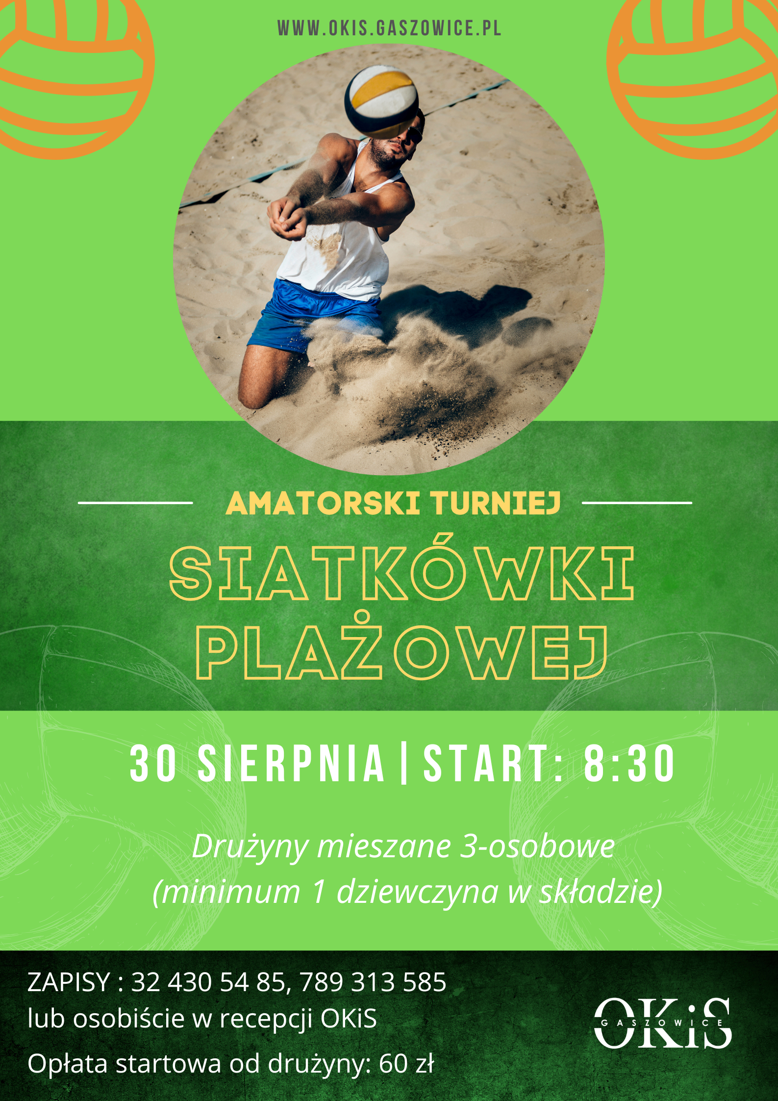 W sobotę 30 sierpnia 2025r., od godziny 8:30, na terenie rekreacyjnym przy OKiS zostanie zorganizowany turniej SIATKÓWKI PLAŻOWEJ.